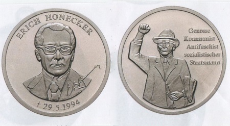 Teure Genossen widmeten ihrem Idol, dem 1994 im chilenischen Exil verstorbenen Erich Honecker, eine Medaille, von seinem Vorgänger Walter Ulbricht sind solche Prägungen nicht bekannt, dafür aber jede Menge Briefmarken mit unterschiedlich bezeichneten DDR-Währungen. (Fotos: Caspar)
