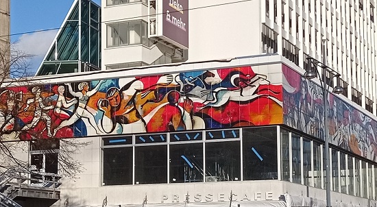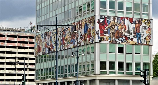 Das von Walter Womacka für das Haus des Lehrers am Berliner Alexanderplatz geschaffene Wandbild war mit der Verherrlichung des Sozialismus in der DDR ganz nach dem Geschmack von Ulbricht und Genossen. Hier musste die von der SED gesteuerte Kunstzensur nicht eingreifen. Die dem sozialistischem Realismus verpflichtete "Bauchbinde" am Pressecafé neben dem Berliner Verlag wurde nach 1990 verbrettert und kam erst 2021 wieder zum Vorschein