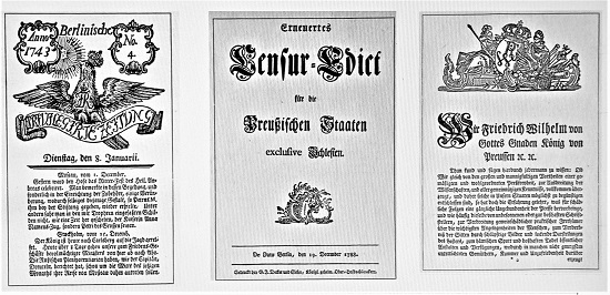 Preußens Könige Friedrich II. und Friedrich Wilhelm II. nahmen Einfluss auf die damalige Presse und sorgten dafür, dass sie günstig über sie, ihre Kriege und ihre Unternehmungen berichtete. Allerdings gelang das nicht immer und überall, weshalb strenge Zensur ausgeübt und 1788, zwei Jahre nach dem Tod von Friedrich II., ein Zensurgesetz erlassen wurde.