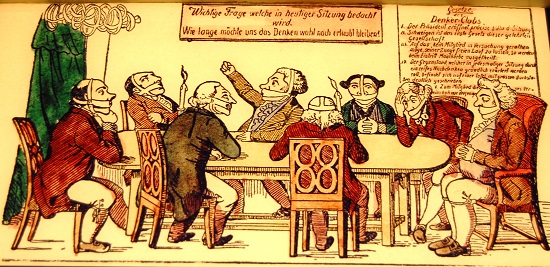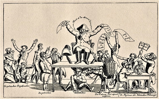 Die Unterdrückung der freien Meinung, Presse und Lehre und die Klaren der mundtot gemachten Schreiber, zu sehen auf einer Karikatur um 1848, nahm im 19. Jahrhundert groteske Formen an.