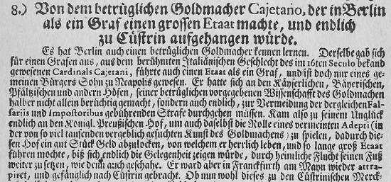 Am Beginn des 18. Jahrhunderts war der erste preußische König Friedrich I. dem Goldmacher Domenico Manuel Cajetano auf den Leim gegangen. Nachdem der Scharlatan dem Monarchen viel Geld als Vorschuss aus der Tasche gezogen, aber kein Gramm künstliches Gold herbei geschafft hatte, wurde er 1709 nach kurzem Prozess aufgeknüpft. Der Fall erregte großes Aufsehen, es wurde sogar eine Medaille geprägt, über die die "Berlinischen Merck- und Denckwürdigkeiten IXte Sammlung" als Vorläufer unserer Tageszeitungen berichten. Der unbekannte Verfasser schreibt, Cajetano habe sich als Graf aus einem berühmten italienischen Geschlecht ausgegeben, dabei war er nur "eines gemeinen Bürgers Sohn" aus Neapel. Nachdem er sich an den kaiserlichen sowie bayerischen, pfälzischen und anderen Höfen mit seiner betrügerischen Wissenschaft "berüchtigt" gemacht, sei er zur Vermeidung von Strafen an den königlich-preußischen Hof gegangen. Ungeachtet der Warnungen vom Pfälzer und Wiener Hof setzte der von hohen Schulden gedrückte, aber auf großem Fuß lebende Preußenkönig alle seine Hoffnungen auf Cajetano und glaubte seinen Versprechungen.