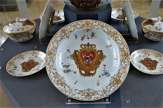 Im Dresdner Zwinger werden Meißner Geschirre und Figuren gezeigt, hier Teller aus dem 18. Jahrhundert mit dem sächsisch-polnischen Wappen.