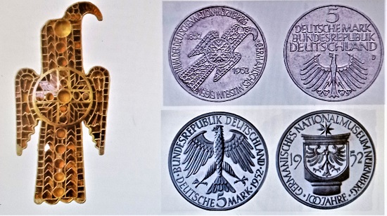 Schmuckfibeln wie die auf der Münze von 1952 dienten hochgestellten Personen als Zierde und zum Schließen von Kleidungsstücken und gehören zum Besten, was Goldschmiede der Völkerwanderungszeit geschaffen haben. Dass Roth, die Jury und der Bundespräsident die Adlerfibel, die aus einem um das Jahr 500 dem Boden anvertrauten, nach seiner Entdeckung leider von geldgierigen „Verwertern“ in alle Winde verstreuten Fund von geradezu fürstliche Pracht stammt, als Motiv für das Fünfmarkstück auswählten, lässt sich gut erklären. Denn das kostbare Schmuckstück war und ist „das“ Wahrzeichen des Germanischen Nationalmuseums.