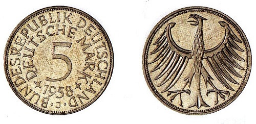 Außer dem 1951 ausgegebenen Fünf-Mark-Stück aus Silber mit dem dünnen Bundesadler und der großen Wertzahl – hier die seltene Ausgabe 1958 J – wurden ab 1950 eine Ein-Mark-Münze und nur 1951 ein Zwei-Mark-Stück geprägt. Da es mit der Ausgabe zu einer Mark verwechselt wurde, blieb es bei diesem einzigen Jahrgang 1951.