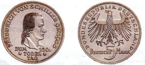 Wurde die „Adlerfibel“ auf Anhieb ausgeführt, so geriet das Auswahlsystem schon bei der nächsten Emission von 1955 durcheinander. Denn nicht der mit dem ersten Preis bedachte Entwurf von Fritz Nuss mit einem expressionistisch anmutenden sowie dem Dichterlorbeer geschmückten Kopf von Friedrich Schiller wurde in Stuttgart geprägt, sondern das drittplatzierte Modell von Alfons Feuerle, das ein ganz der Zeit um 1800 verpflichtetes Bildnis des Dichters zeigt. Ein Blick in die numismatische Literatur zeigt, dass die Kür eines Modells durch das Preisgericht nicht automatisch die Realisierung bedeutete. Es kam vor, dass auf Wunsch der Bundesregierung, die in dieser Frage immer das letzte Wort hatte und hat, selbst viertplatzierte Entwürfe zur Ausführung kamen.