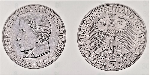 Die die ersten drei silbernen Fünf-Mark-Münzen, so war auch die Ausgabe eines erneut in nur 200 000 Exemplaren geprägten Fünf-Mark-Stücks von 1957 nach einem Entwurf von Karl Roth auf den 100. Todestag von Joseph von Eichendorff Ergebnis von persönlicher Einflussnahme und politischer Lobbyarbeit. Der Nominierung des Dichters kam entgegen, dass es sich bei ihm um eine „Persönlichkeit jenseits der Oder-Neiße-Linie“ handelt, wie man damals sagte, also eines Gebietes, auf das die damalige Bundesregierung und große Teile der westdeutschen Öffentlichkeit ungeachtet der Bestimmungen des Potsdamer Abkommens von 1945 Ansprüche erhoben. So war die Eichendorff-Münze nicht nur eine Hommage an einen großen Künstler des 19. Jahrhunderts, sondern hatte auch eine politische Zielrichtung.