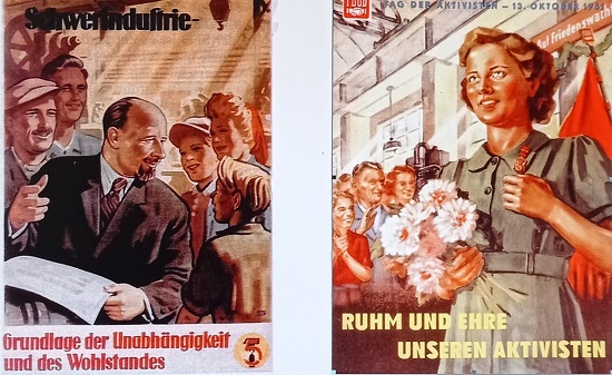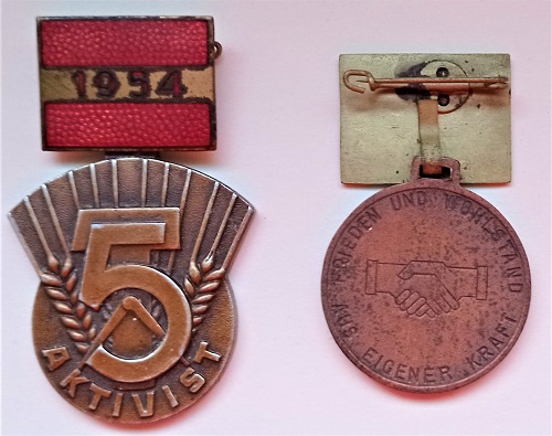 Um sich als Aktivist oder Aktivistin auszuweisen, steckte man sich unterschiedlich gestaltete Medaillen an. Auf frühen Stücken aus bronziertem Aluminium ist in roter Farbe die Zahl 5 als Hinweis zu erkennen, dass sich jemand um die Erfüllung des Fünfjahrplans verdient gemacht hat. Als um 1960 aus dem Fünf- ein Siebenjahresplan wurde, gab es neue Abzeichen mit der Zahl 7 und der Parole "Auf sozialistische Art zu leben heißt auf sozialistische Art zu arbeiten."