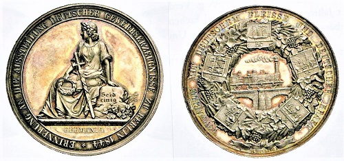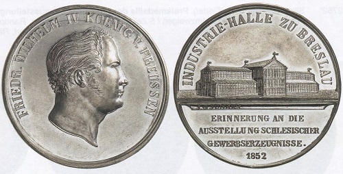 Die Reihe der Städte, die seit 1851, beginnend mit London, eine Weltausstellung ausgerichtet haben, ist lang, doch ist Berlin nicht darunter. Zwar gab es dort schon 1844 eine Gewerbeausstellung, aber sie war nur eine eher regionale Veranstaltung. Medaillensammlern ist die Prägung aus Silber oder Kupfer mit einer sitzenden Borussia auf der Vorderseite und einer schnaufenden Eisenbahn bekannt. Um sie herum werden in einem Kranz sechs Errungenschaften des Industriezeitalters wie die Dampfschifffahrt, der mechanische Webstuhl und die Dampfmaschine gewürdigt. Teilnehmer einer Tombola, die eine Niete gezogen hatten, erhielten die heute noch recht häufige Kupferversion als Trostpreis.