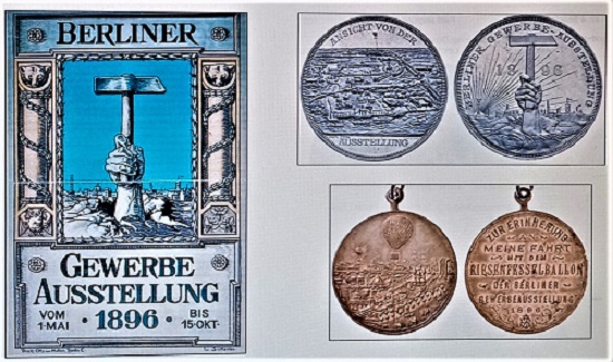 Die Befürworter der Berliner Weltausstellung ließen sich von Rückschlägen nicht beirren und bereiteten statt ihrer eine große Gewerbeausstellung vor, die dann tatsächlich mit großer Publikumsbeteiligung vom 1. Mai bis 15. Oktober 1896 stattfand. Beworben wurde die durch ein von dem bekannten Grafiker und Schriftgestalter Ludwig Sütterlin entworfenes Plakat, auf dem eine Arbeiterhand mit Hammer vor blauem Grund aus der Erde emporwächst. Die dazu gehörige Medaille zeigt das gleiche Motiv, kombiniert mit einem Blick auf das Ausstellungsgelände im Treptower Park, der damals noch weit vor den Toren Berlins lang.