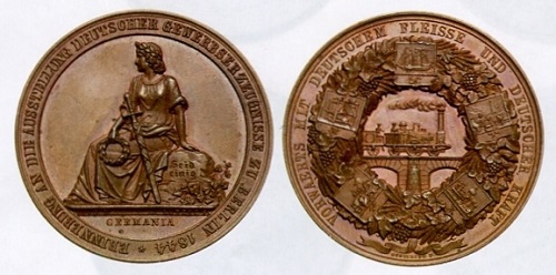 Als 1844 im Berliner Zeughaus die "Ausstellung deutscher Gewerbserzeugnisse" veranstaltet wurde, hat man eine prachtvolle Medaille mit hohem Relief geprägt, auf deren Vorderseite eine sitzende Germania mit Schwert und Siegeskranz zu erkennen ist. Auf der Rückseite ist die bei Borsig gebaute Dampflok BEUTH, benannt nach Peter Beuth, dem Direktor der Technischen Deputation für das Gewerbe, dargestellt. Sie fährt gerade über eine Brücke und ist damit im übertragenen Sinne auf dem Weg in die Zukunft. Symbolische Darstellungen von modernen Industrieprodukten und Gewerbeerzeugnissen auf einem Früchte- und Ährenkranz auf der und die Widmung MIT DEUTSCHEM FLEISSE UND DEUTSCHER KRAFT umschließen die Lokomotive. Eine kleine Bronzemedaille von 1858 mit der Darstellung einer Lok war eine frühe Betriebsauszeichnung, diente aber auch, mit einer Zahl versehen, den Borsigianern als Kontroll- und Passiermarke. Solche Prägestücke sind auch aus der Königlichen Münze zu Berlin bekannt, die sich um 1900 dem Trend anschloss, langjährige Mitarbeiter für treue Dienste durch Plaketten mit eingraviertem Namen zu ehren.