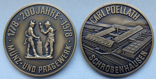 Zum zweihundertjährigen Firmenjubiläum gab das Carl Poellath Münz- und Prägewerk in Schrobenhausen 1978 eine Medaille mit einem am Amboss prägenden Merkur und dem Fabrikgelände in der Vogelperspektive heraus. (Fotos: Caspar)