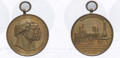 Die Medaille von 1858 zur Fertigstellung der eintausendsten Lokomotive kommt mit und ohne Öse vor.