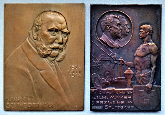 Anlässlich von Firmenjubiläen und zu anderen Gelegenheiten herausgegebene Medaillen und Plaketten waren und sind bestens geeignet, auf das jeweilige Unternehmen aufmerksam zu machen und für seine Erzeugnisse zu werben. Das tun die Jugendstil-Plakette von 1914 des Wiener Graveurs und Medailleurs Johann Schwerdtner von 1914 und die Neujahrsmedaille von 1905 der Württembergische Metallwarenfabrik (WMF) in Pforzheim, die eine Auswahl ihrer Erzeugnisse und im Hintergrund eine Friktionspresse zeigt, die dabei im Einsatz war.