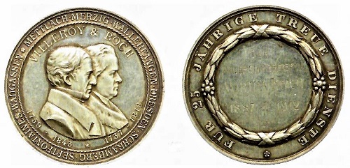 Auf der Medaille für 25 Jahre treue Dienste sind Nicolas Villeroy und Pierre-Joseph Boch, der Chef des Familienunternehmens Jean-François Boch et Frères, im Kostüm des frühen 19. Jahrhunderts abgebildet. Der äußere Schriftrand nennt Standorte des bis heute erfolgreich tätigen Unternehmens.