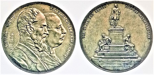 Die von Albert Scharff geschaffene Medaille von 1892 mit den Porträts von Alfred und Friedrich Alfred Krupp bildet das von der Familie und den Werksgenossen gestiftete Denkmal mit einem Schmied und einer Mutter mit Kind auf dem Sockel präzise ab.