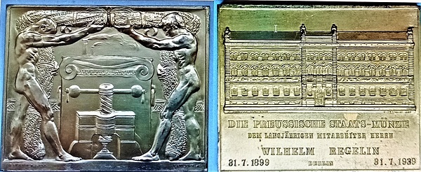 Die im frühen 20. Jahrhundert von Paul Sturm und Reinhard Kullrich geschaffene Jugendstilplakette aus vergoldetem Messing mit Männern neben der Spindelpresse und der Gebäudeansicht der ehemaligen Königlichen Münze zu Berlin wurde 1939 zum vierzigjährigen Betriebsjubiläum von Wilhelm Regelin vergeben.