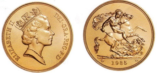 Zum Porträt von Queen Elizabeth II. kontrastieren auf den Rückseiten die unterschiedlich mit heraldischen Symbolen sowie die auf einem Felsen sitzende Britannia, Bauwerke, Pflanzen, Tiere und andere Bilder. Eines der schönsten Motive stammt aus dem 19. Jahrhundert. Vom Münzgraveur Benedetto Pistrucci geschaffen, ist in klassischer Weise der als Landespatron verehrte Heilige Georg als Drachentöter abgebildet. Da das mit dem Reiter geschmückte Fünfpfundstück aus Gold wesentlich den Nominalwert übersteigt, taucht es nicht im normalen Geldverkehr auf, sondern ist als Anlagegoldmünze beliebt.