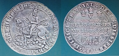 Auf der in Oxford geprägten Silberkrone von 1644 reitet Charles I. wie auf deutschen Taler vor einer Stadtansicht. Die nachlässig geprägten Schillinge verloren durch Beschneidung an Wert.