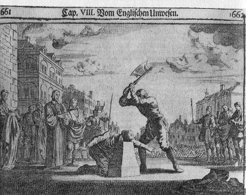 In dem bis 1646 tobenden Bürgerkrieg standen der Adel mit dem König an der Spitze und die Katholiken einer von den Handelsstädten mit London an der Spitze und dem Parlament gebildeten Front gegenüber. Zwei Schlachten bei Marston Moor 1644 und bei Naseby 1645 gingen für Niederlagen von Charles I. und seinen Anhängern aus. Sie hatten den Machtkampf verloren, und so wurden besonders verhasste Anhänger von ihm hingerichtet. Daraufhin wurde ihm den Prozess gemacht wird, der mit dem Todesurteil endete. Als der König am 30. Januar 1649 im Palast von Whitehall in London vor dem Henker kniete und seinen Kopf auf den Block legte, soll er ruhig und gefasst gewesen sein. Fast auf den Tag 144 Jahre später ereilte den französischen König Ludwig XVI. und seiner aus Österreich stammenden Gemahlin Marie Antoinette ein ähnlich blutiges Schicksal.
