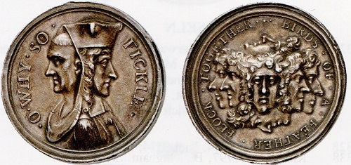 Die satirische Medaille ohne Jahreszahl bezieht sich auf die angebliche Papistenverschwörung, mit der versucht wurde, in England lebende Katholiken zu diskreditieren und ihnen ein gegen Charles II. gerichtetes Mordkomplott anzuhängen.