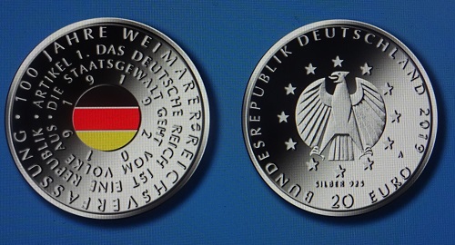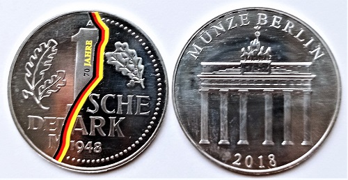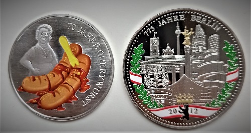 Die erste in Berlin produzierte Farbmünze widmete sich 2019 der einhundert Jahre zuvor in Weimar beschlossenen Reichsverfassung. Um die Farben schwarz, rot und gold ist der erste Satz in der Verfassung „Das Deutsche Reich ist eine Republik. Die Staatsgewalt geht vom Volke aus.“ gelegt. Die gleichen Farben schmücken die in der Staatlichen Münze Berlin geprägte Medaille von 2018, deren Vorderseite die 1948 in beiden Ländern Staaten geschaffene Deutsche Mark kombiniert, getrennt durch einen schwarz-rot-goldenen Streifen. Andere Farben auf die Curry-Wurst-Medaille und weitere Pragungen zu applizuieren war gewiss nicht einfach.i öäwedaerrt