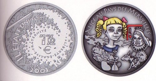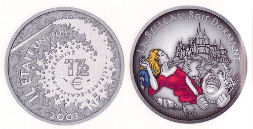 Frankreich hat vor zwanzig Jahren damit begonnen, seine Märchenmünzen – hier Dornröschen und Alice im Wunderland – zu kolorieren, manche sagen aber auch zu verschandeln.