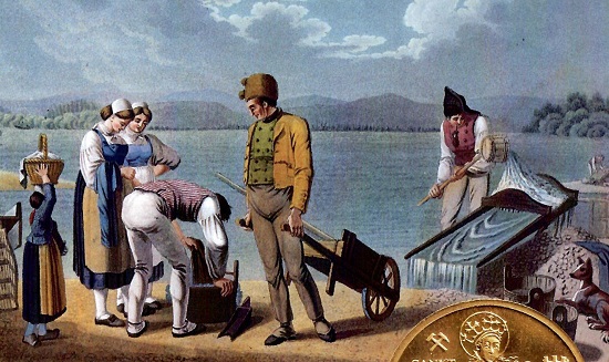 Ein Blick in die Geschichte zeigt, dass weltliche und geistliche Fürsten im Rhein- und Donaugebiet seit der Barockzeit aus dem an ihren Flüssen gewonnenen Edelmetall spezielle Dukaten prägen ließen, die voller Absicht ihre Herkunft unterstreichen. Das aus dem goldhaltigen Sand des Rheins und der Donau, des Inns, der Eder, Isar und Salzach sowie anderer Flüsse in einem aufwändigen Verfahren gewaschene Metall reichte aus, um attraktive Stücke in größerer Zahl herzustellen. Die Prägeherren konnten vor der Mitwelt prahlen, eigene Goldressourcen zu besitzen. Mit ihren Inschriften und allegorischen Figuren geben sie ihre Herkunft durch Personifikationen der jeweiligen Flüsse zu erkennen. Umschriften wie EX AURO RHENI (Aus dem Gold des Rheins), EX AURO OENI (Aus dem Gold des Inns) oder EX AURO ISARE (Aus dem Gold der Isar) findet man auf Dukaten bayerischer Kurfürsten und Könige.