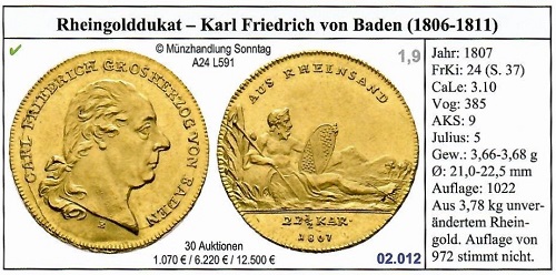 AUS RHEINSAND besteht eine 1807 geprägte Probemünze des Großherzogs Carl Friedrich von Baden, wie er in Lothar Schumachers Katalog vorgestellt wird. Die Angabe 22 ½ Karat gibt den Feingehalt dieses Goldstücks an, auf dessen Rückseite "Vater Rhein" das badische Wappen in der Hand hält. Dass der Dukat von 1807 den Hinweis "Aus Rheinsand" trägt, ist wohl dem Bestreben geschuldet, die deutsche Sprache zu pflegen. Es kommen auch undatierte Flussgolddukaten aus der Zeit um 1804 mit lateinischen Aufschriften vor.