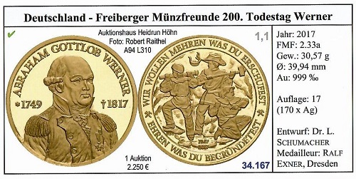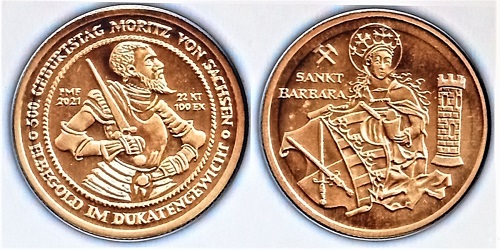 Die Medaille im Dukatengewicht mit dem Bildnis des sächsischen Kurfürsten Moritz und der Heiligen Barbara als Schutzpatronin der Bergleute wurde 2021 von den Freiberger Münzfreunden e. V. herausgebracht. Der Verein ehrte 2017 den Mineralogen und Freiberger Bergrat Abraham Gottlob Werner mit einer Goldmedaille im Gewicht von einer Unze mit seinem Porträt und einer Bergbauszene. Nach ihm ist ein Institutsgebäude der TU Bergakademie Freiberg benannt.