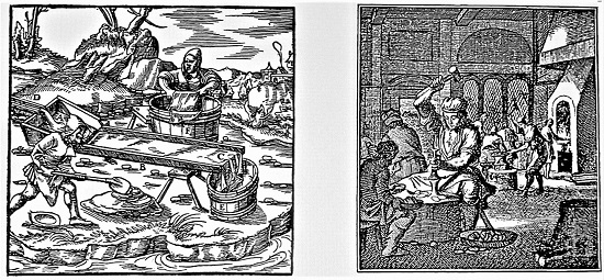 Wie man Flussgold mit Hilfe von Fellen, Teppichen oder Matten gewonnen hat, schildert der Holzschnitt aus dem Buch "De re metallica" von Georgius Agricola aus dem Jahr 1556. Der Kupferstich daneben zeigt die Schmelze und manuelle Münzprägung in einer Werkstatt des frühen 18. Jahrhunderts.