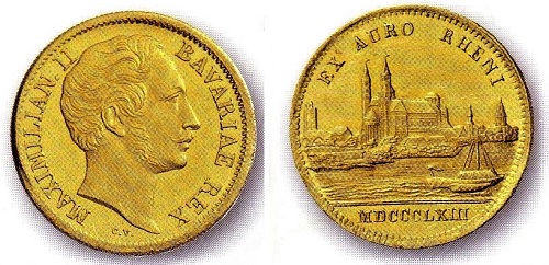 Bayerische Flussgolddukaten hat man im 18. Jahrhundert mit Symbolfiguren geschmückt, auf dem Exemplar von 1756 ist es der Inn. Auf dem Rheingolddukaten von 1863 erkennt man den Dom zu Speyer.