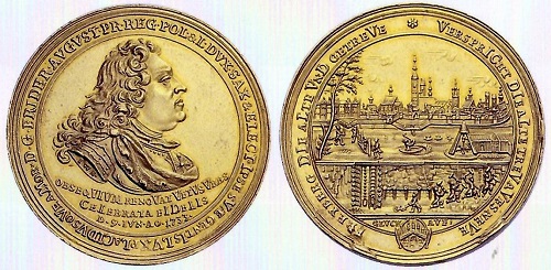 Die Freiberger Huldigungsmedaille von 1733 im Wert von zehn Dukaten verbindet das Bildnis des sächsischen Kurfürsten und polnischen Königs Friedrich August II. (August III.) mit einer Stadtansicht und einer Bergbauszene untertage. (Fotos/Repros: Caspar, Schumacher, TU Bergakademie Freiberg)