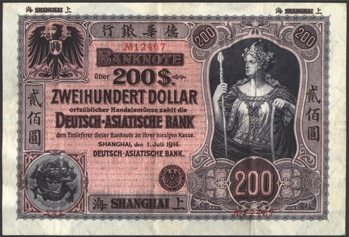 Der 1914 in Shanghai ausgegeben Geldschein der Deutsch-Asiatischen Bank gibt den Wert 200 Dollar in deutscher Sprache und der Landessprache an.
