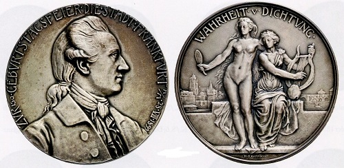 Frankfurt am Main widmete 1899 seinem großen Sohn eine prächtige Johann Wolfgang von Goethe eine Medaille, die sein Porträt mit der Allegorie von Dichtung und Wahrheit verbindet. (Fotos/Repros: Caspar)