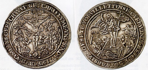 Als Amulette und Mutmacher waren im 16. Jahrhundert geprägte Pesttaler mit Szenen von der Kreuzigung und Auferstehung Christi beliebt.