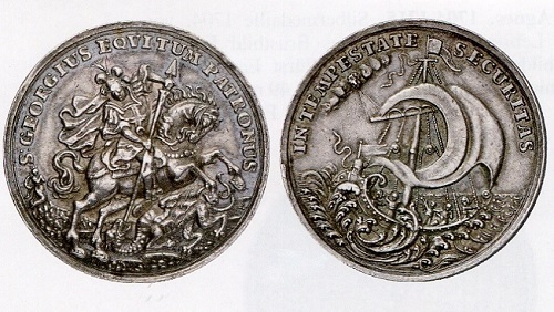 In zahlreichen Abwandlungen und sogar Ausführungen aus Gold überliefert sind die Kremnitzer Georgs- und Schiffsmedaillen mit dem Motto „Sicherheit im Sturm“. Ihr Motiv bezieht sich auf ein Gleichnis im Markusevangelium 4,38-41, das in der Lutherbibel von 2017 so formuliert ist: „Und am Abend desselben Tages sprach er zu ihnen: Lasst uns ans andre Ufer fahren. Und sie ließen das Volk gehen und nahmen ihn mit, wie er im Boot war, und es waren noch andere Boote bei ihm. Und es erhob sich ein großer Windwirbel, und die Wellen schlugen in das Boot, sodass das Boot schon voll wurde. Und er war hinten im Boot und schlief auf einem Kissen. Und sie weckten ihn auf und sprachen zu ihm: Meister, fragst du nichts danach, dass wir umkommen? Und er stand auf und bedrohte den Wind und sprach zu dem Meer: Schweig! Verstumme! Und der Wind legte sich und es ward eine große Stille. Und er sprach zu ihnen: Was seid ihr so furchtsam? Habt ihr noch keinen Glauben? Und sie fürchteten sich sehr und sprachen untereinander: Wer ist der, dass ihm Wind und Meer gehorsam sind!“