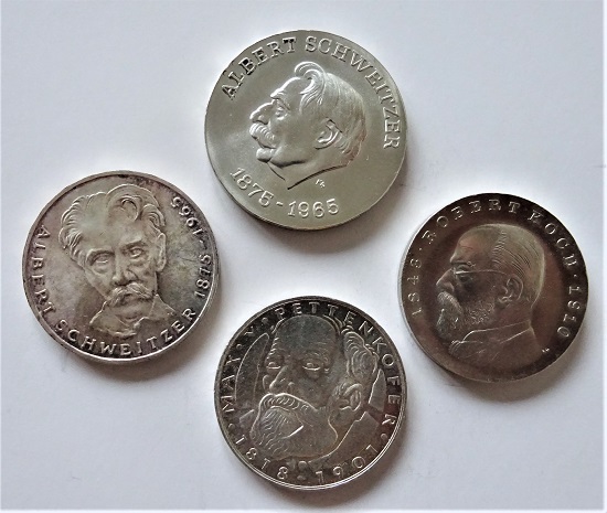 Münzen der DDR und der Bundesrepublik Deutschland von 1975 zu Ehren von Albert Schweitzer, Robert Koch und Max von Pettenkofer könnten am Anfang einer Sammlung zum Thema „Medicina in nummis“ stehen.