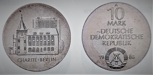 Krankenhäuser und Kliniken auf Münzen und Medaillen wie hier die 1710 gegründete Charité in Berlin auf eine Zehnmarkstücke der DDR von 1986, gehören in ein Gebiet, das sich mit Medizin und Gesundheitsvorsorge befasst.