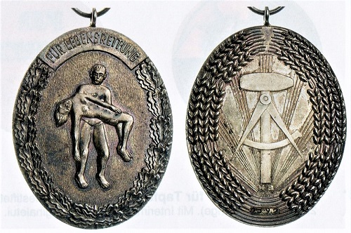 In das Sammelgebiet gehört auch alles, was mit Lebensrettung zu tun hat, so auch diese ovale DDR-Medaille aus Silber, die laut den Buchstaben MB auf der Rückseite unten im VEB Münze Berlin hergestellt wurde. (Foto/Repros: Caspar)
