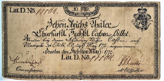 Der Not gehorchend, eröffnete Sachsen 1772 seine Geldscheingeschichte, Preußen und andere zogen alsbald nach.