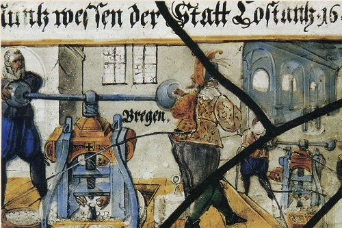 Das Glasfenster von 1624 zeigt, wie in der Münze zu Konstanz Geldstücke auf Spindelpressen hergestellt wurden. Die Geräte mit langen Kugelarmen wurden im frühen 19. Jahrhundert durch Kniehebelpressen abgelöst.