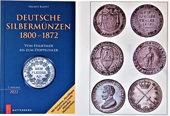Der neue Kahnt-Katalog hat 746 Seiten sowie zahlreiche schwarz-weiße Abbildungen und kostet 49,90 Euro (ISBN 978-3-866-46-217-5). Den Buchumschlag schmückt ein hochseltener Prämiendoppeltaler der Freiberger Bergakademie von 1841. Auf dem Bild rechts sind Konventionstaler des Fürstentum Reuß Jüngere Linie 1812 und des Bistums Münster 1801 sowie ein Kronentaler des Herzogtums Sachsen-Coburg und Gotha von 1827.