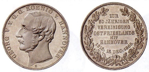 Dass Hannover 1865 die fünfzigjährige Zugehörigkeit des ehemaligen Fürstentums Ostfriesland feiern konnte, hatte mit der 1815 unterzeichneten Schlussakte des Wiener Kongresses zu tun. Danach musste Preußen, unter dessen Herrschaft Ostfriesland seit Friedrich dem Großen stand, an Hannover abtreten. König Georg III. von England, der zugleich König von Hannover war, wollte so verhindern, dass sich Preußen an der Nordseeküste festsetzt. Nach der Annexion des Königreichs Hannover 1866 im Ergebnis des Deutschen Kriegs gegen Österreich machte sich Preußen an der Nordseeküste breit. Die Eingliederung Ostfrieslands in die neue preußische Provinz Hannover verschaffte der vernachlässigten Küstenregion wirtschaftlichen Auftrieb. Benannt ist der Upstalboomtaler von 1865 mit dem Motto EALA FRYSIA FRESENIA (etwa "Auf, ihr freien Friesen") nach einer mittelalterlichen Thingstätte bei Rahe südwestlich von Aurich. Umstritten ist, worum es sich beim Upstalboom gehandelt hat. Der "Boom" lässt einen großen Baum auf einem Versammlungsplatz vermuten. Sprachforscher und Historiker meinen, dass es sich um einen Grenzbaum, eine Sperre oder einen Pfahl gehandelt haben könnte. Archäologen haben den auch als Grabstätte genutzten Hügel untersucht und Urnen aus der Bronze- und Eisenzeit gefunden. Eine 1833 auf dem Upstalboom-Hügel errichtete Steinpyramide erinnert an die Ostfriesen, die 1815 in den Schlachten von Ligny und Waterloo fielen. Die Prägung beider Gedenktaler nutzte dem blinden König Georg V. wenig, denn er verlor im Ergebnis des Deutschen Kriegs von 1866 an der Seite Österreichs zwar nicht seinen Kopf, wohl aber Krone und Thron, musste ins Exil gehen und starb 1878 in Paris.