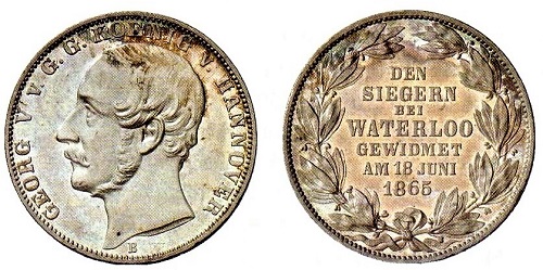 Die Könige von Hannover waren prägefreudige Herren, ihnen verdanken wir einige interessante Geschichtstaler wie den so genannten Waterlootaler, den Georg V. 1865 anlässlich des 50. Jahrestags der Schlacht von Waterloo in einer Auflage von 15 000 Exemplaren mit der Aufschrift DEN SIEGERN BEI WATERLOO GEWIDMET DEN 18 JUNI 1865 prägen ließ. In der Schlacht kämpften auf der einen Seite Truppen des aus dem Exil auf der Mittelmeerinsel Elba zurückgekehrten französischen Kaisers Napoleon I. und auf der anderen preußischen und englischen Soldaten sowie solchen aus Hannover, das zur britischen Krone gehörte, und aus weiteren deutschen Staaten. Hannover war auf seine Beteiligung am Entscheidungskampf über Napoleon I. so stolz, dass von 1825 bis 1832 mitten in der Haupt- und Residenzstadt eine knapp 47 Meter hohe, inwendig begehbare Säule errichtete und dies auch auf einer Medaille feierte.