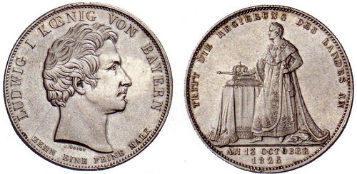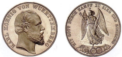 Mit dem Regierungsantritt König Ludwigs I. 1825 begann in Bayern auch die Periode der Geschichtstaler, die Ereignisse und Gestalten der Landegeschichte auf neuartige Weise würdigten und zum Vorbild ähnlicher Ausgaben in anderen Bundesstaaten wurden. Der Siegestaler von 1871 kombiniert den Kopf von König Karl von Württemberg mit einer Viktoria, die über Fahnen und Kanonen schwebt.