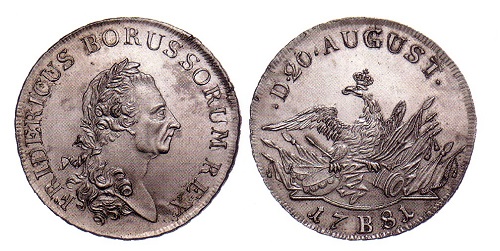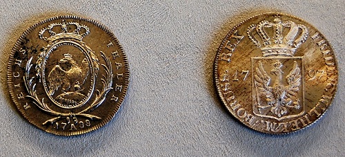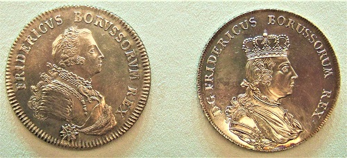 Aus der preußischen Münzgeschichte ist überliefert, König Friedrich II., der Große, habe beim Anblick eines Berliner Talers aus dem Jahr 1755 bemängelt, die Krone auf seinem Kopf sehe aus wie ein „Pot de chambre“, also wie ein Nachttopf, das gekrönte Brustbild komme ihm „zu steif“ vor. Deshalb wurde diese Silbermünze bis auf drei Stück eingeschmolzen und avancierte damit zu einer der seltensten und teuersten preußischen Gepräge des 18. Jahrhunderts. Nach Friedrichs Tod wurden 1787 für Sammler noch einmal 16 Exemplare von den Originalstempeln nachgeprägt. Im Unterschied zu den Originalen mit einem Laubrand besitzen sie einen Kerbrand. Sollten die Nachprägungen von damals im Handel angeboten werden, ist ihnen ein hoher Preis sicher.