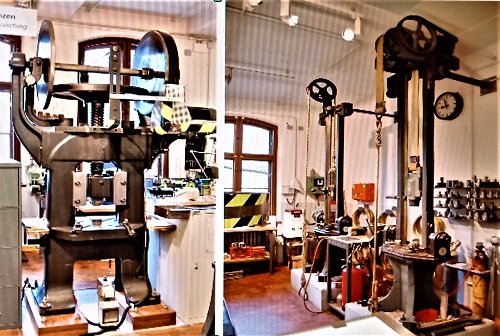 In der Abteilung „Schmuckherstellung“ zeigt das Deutsche Technikmuseum Berlin Maschinen, die in Edelmetallfabriken und Prägeanstalten eingesetzt wurden. Unter großem Getöse lässt der Fallhammer ein schweres Gewicht auf Gesenke und Prägestempel fallen. Die Konstruktion geht auf Leonardo im frühen 16. Jahrhundert zurück.