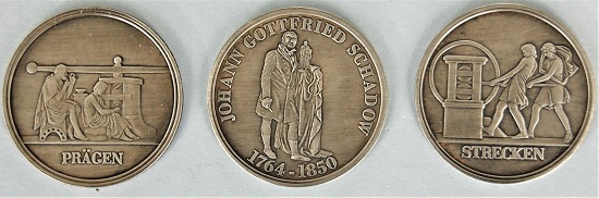 In der Staatlichen Münze Berlin kam 2014 eine Medaillenserie mit Motiven des von Johann Gottfried Schadow um 1800 für die Königliche Münze nach einem Entwurf von David Gilly geschaffenen Münzfrieses, der Meister selbst steht in der Mitte vor dem Modell seines für Wittenberg geschaffenen Lutherdenkmals. (Fotos: Caspar)