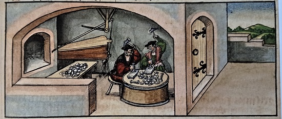 Die farbige Miniatur aus Würzburg gewährt einen Blick in eine Prägestube des 16. Jahrhunderts, in der zwei Münzgesellen am Amboss Geld herstellen. Zu dieser Idylle muss man sich noch weitere vorbereitende Arbeiten und viel Lärm und Qualm hinzu denken, die man auf anderen Grafiken dieser Zeit findet.