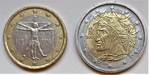 Leonardo da Vinci (1452-1519) wird zu Recht ein Universalgenie genannt, dargestellt ist seine Proportionsstudie von 1492, der so genannte Vitruv-Mensch, auf einer italienischen Euromünze von 2002, daneben ehrte im gleichen Jahr Italien seinen großen Dichter Dante mit einer zwei-Euro-Münze.